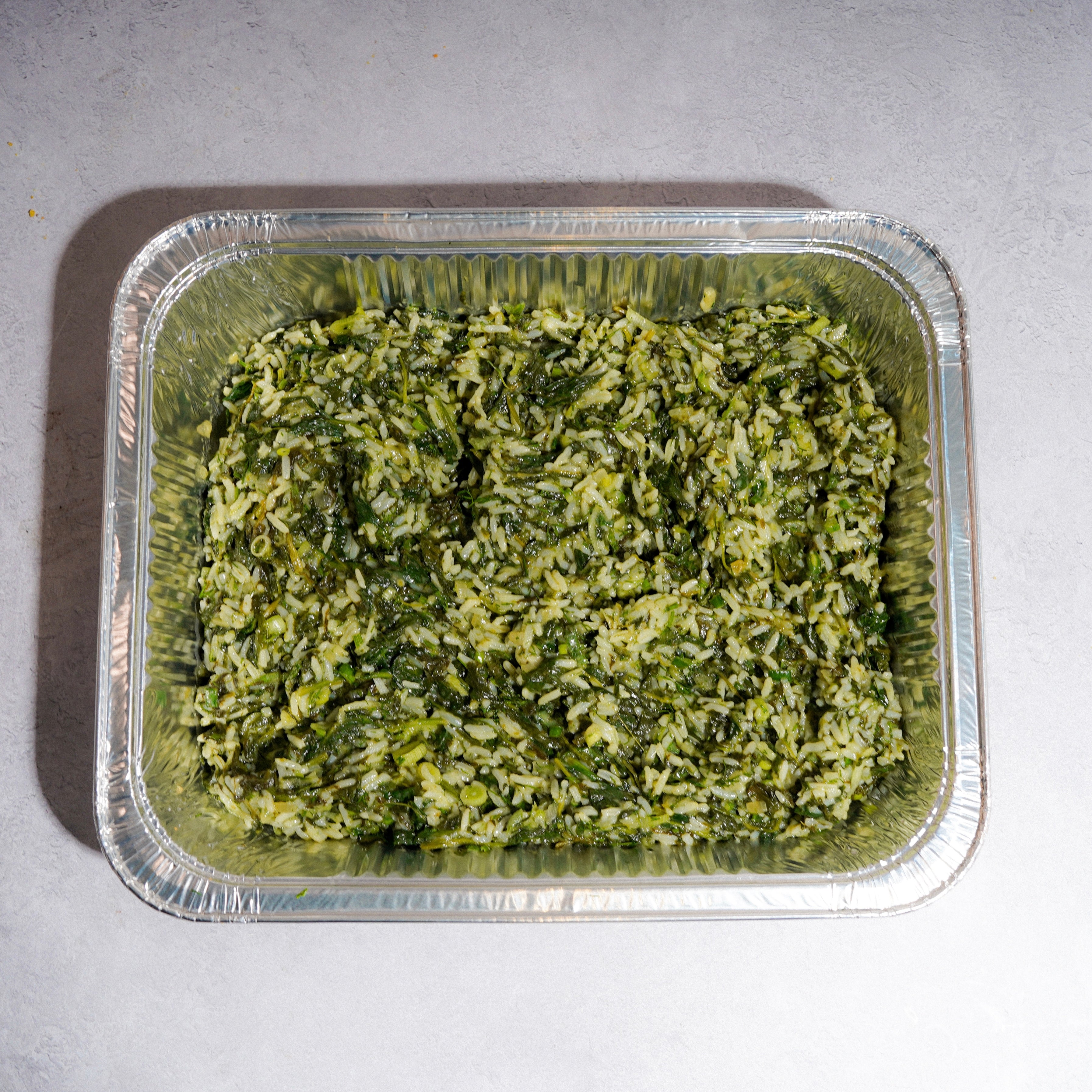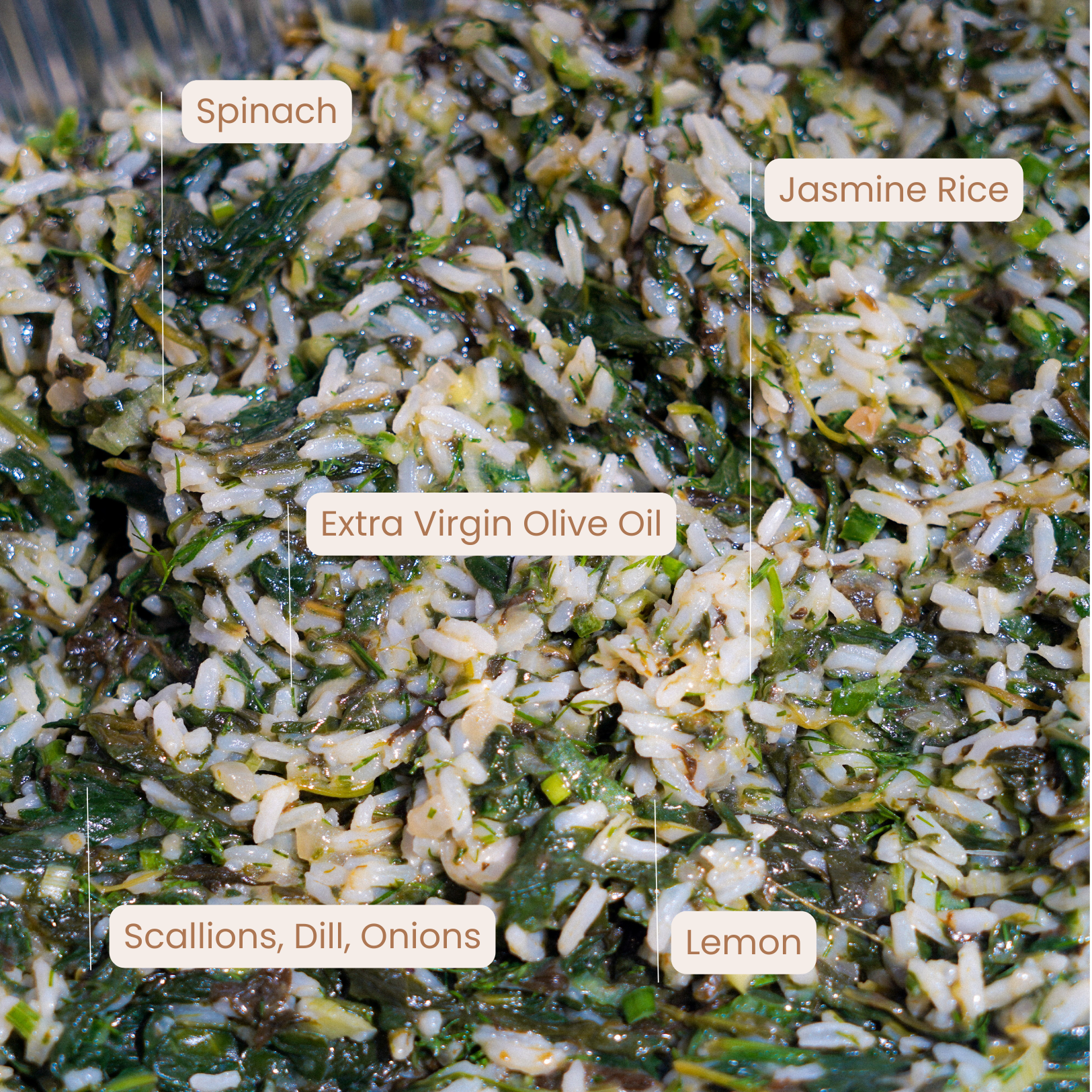 A Mediterranean classic thoughtfully prepared for wholesome, vibrant eating. Tender spinach is sautéed with fragrant dill, parsley, and scallions, then simmered with fluffy rice in a light, citrus-infused broth.
