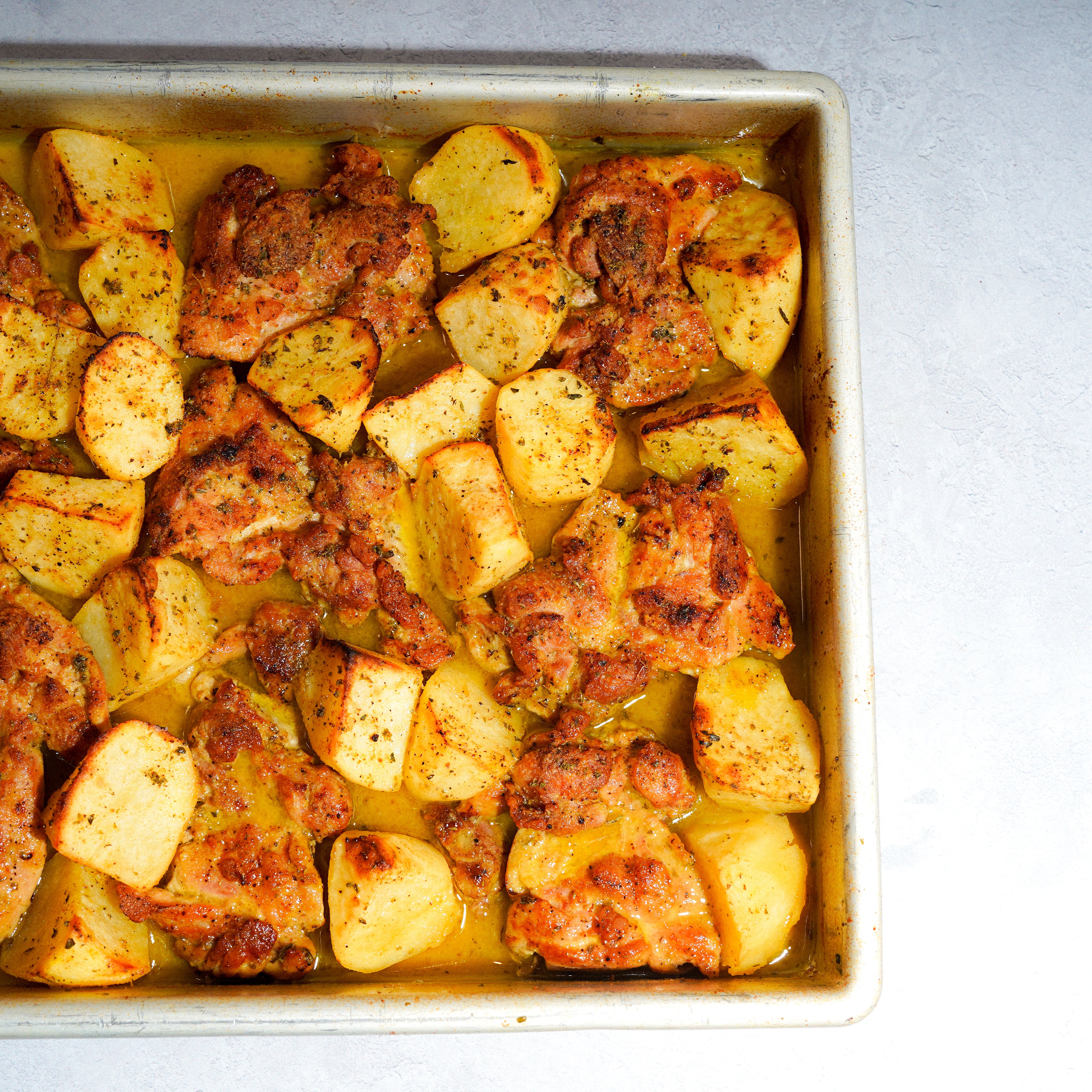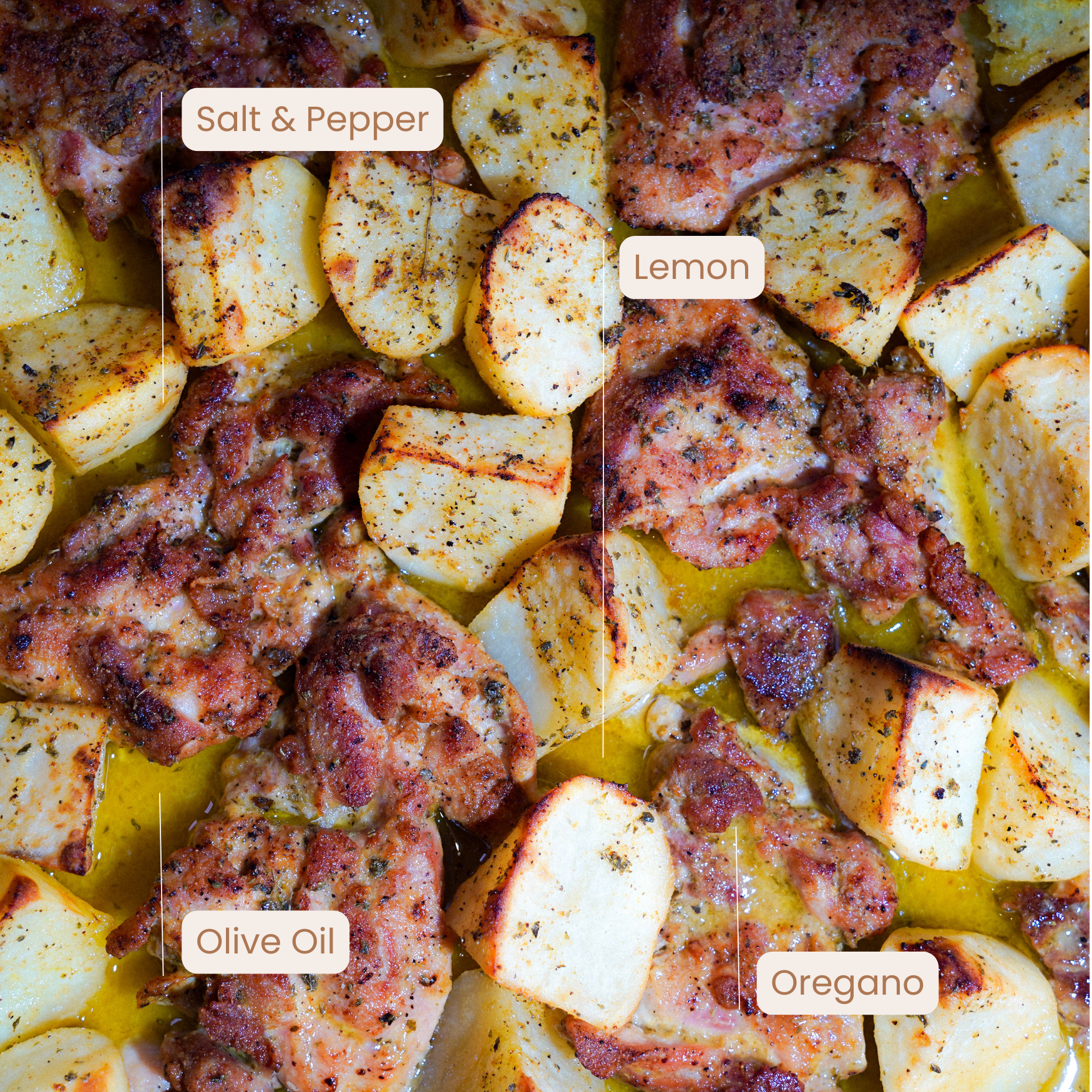 Pasture-raised chicken thighs, Yukon gold potatoes, fresh lemon juice, cold-pressed olive oil, garlic, oregano, sea salt, black pepper.